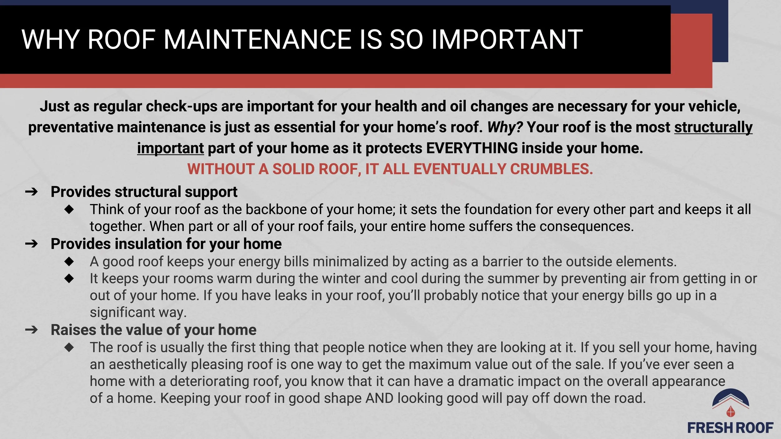 How your roof works for you 24/7.  It deserves care and maintenance.